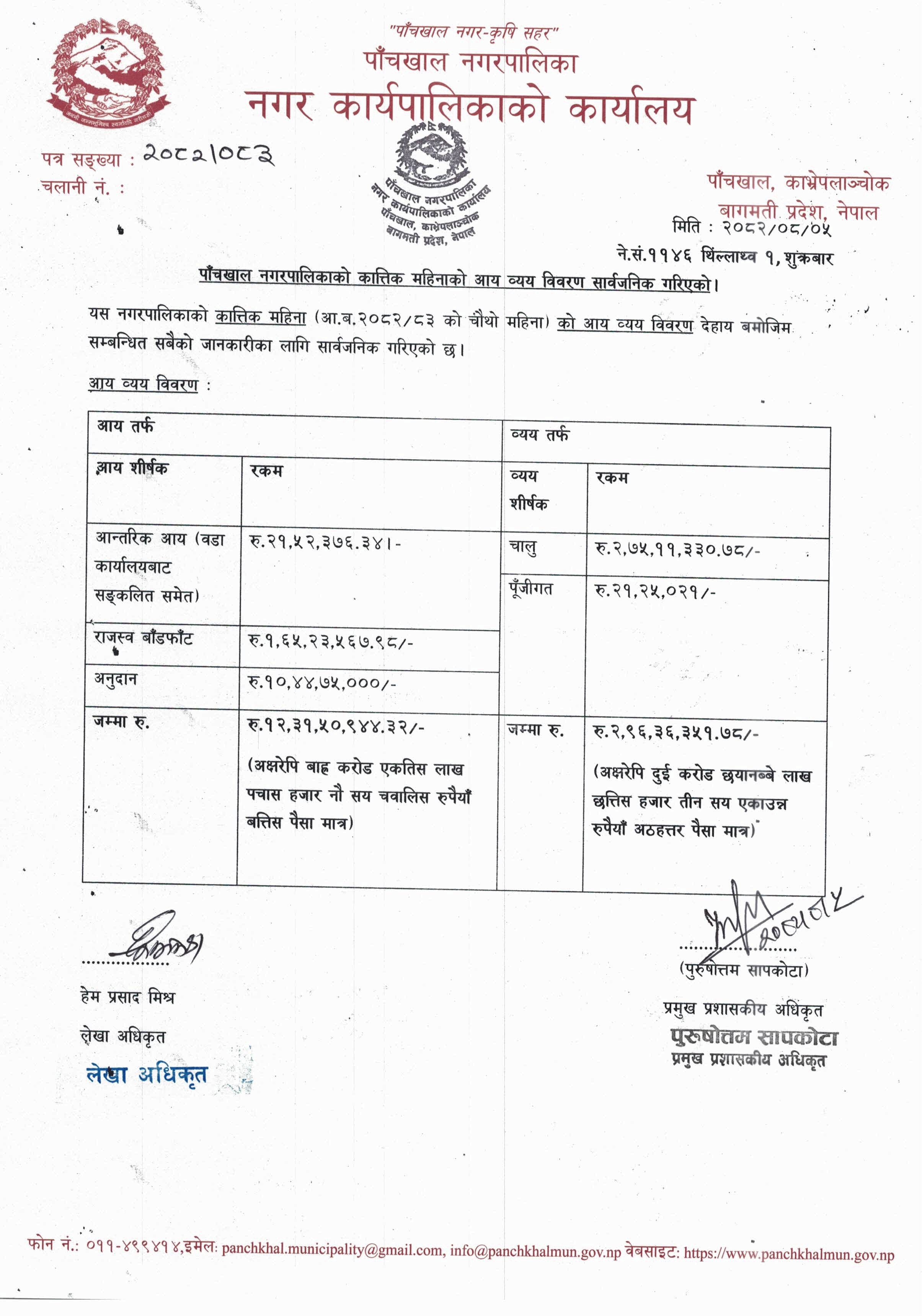 The income and expenditure details of Panchkhal Municipality for the month of Kartik have been made public.