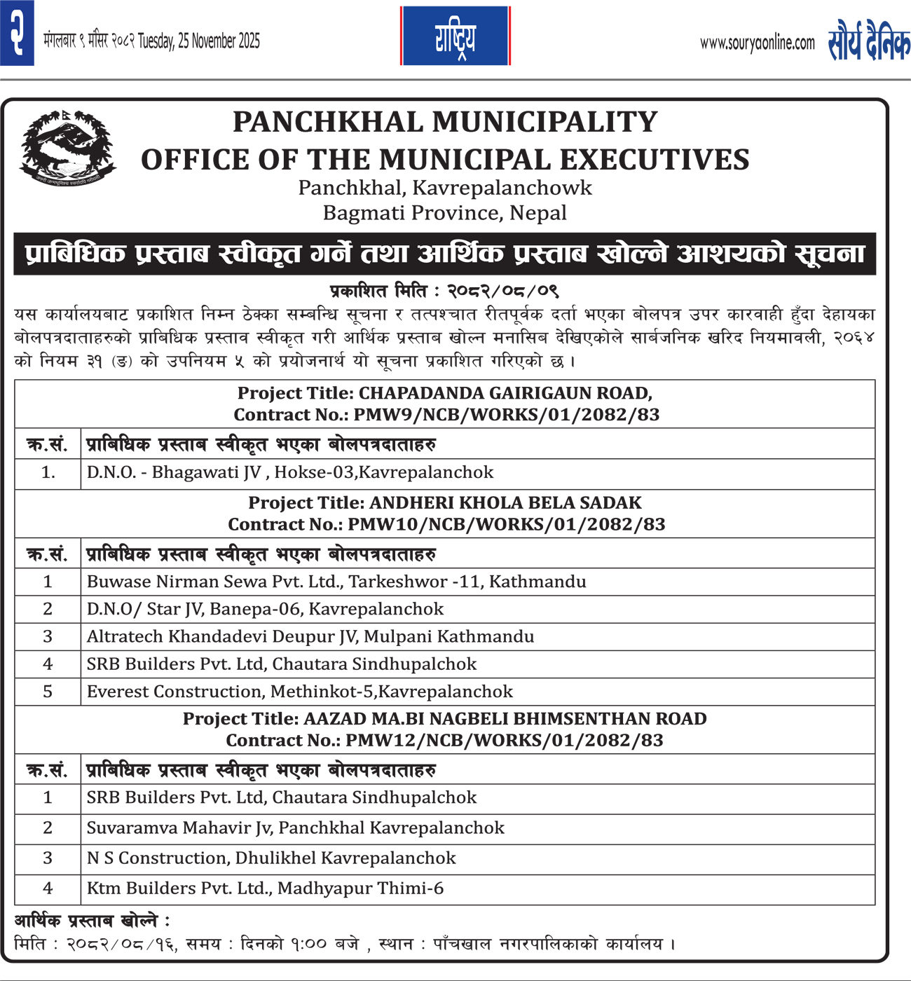 Notice regarding approval of the technical proposal and opening of the financial proposal.