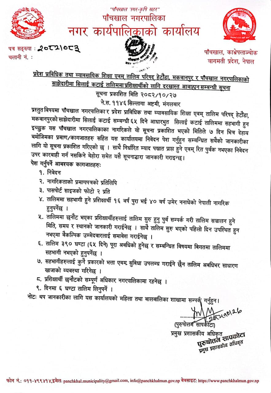 Notice Regarding Call for Applications for Trainer in Sewing and Cutting Training Program Conducted in Partnership with the Provincial Council for Technical and Vocational Education and Training, Hetauda, Makwanpur and Panchkhal Municipality