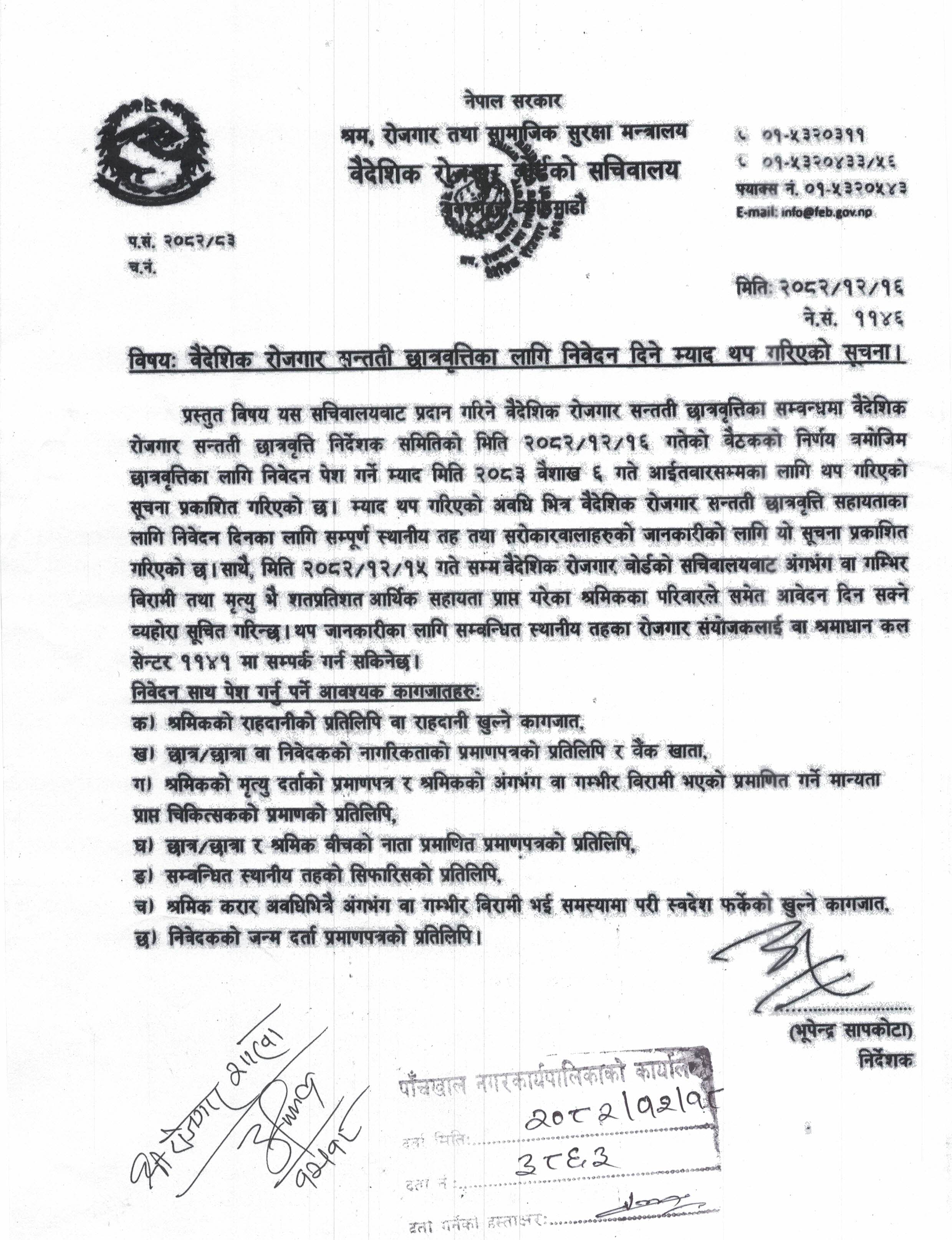 वैदेशिक रोजगार सन्तति छात्रवृत्तिका लागि निवेदन दिने म्याद थप गरिएको सूचना।