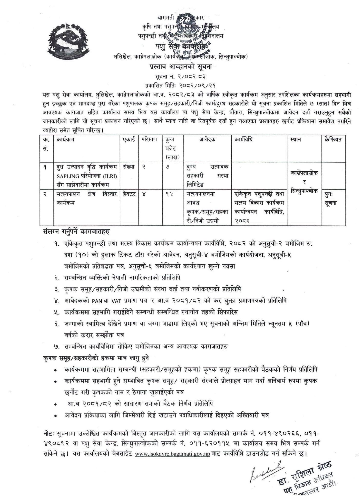 आ.ब.२०८१/८२ मा स्थापित भएका गाईभैँसी पकेट निरन्तरता कार्यक्रममा साझेदारहरूलाई सम्झौता आव्हानको सूचना