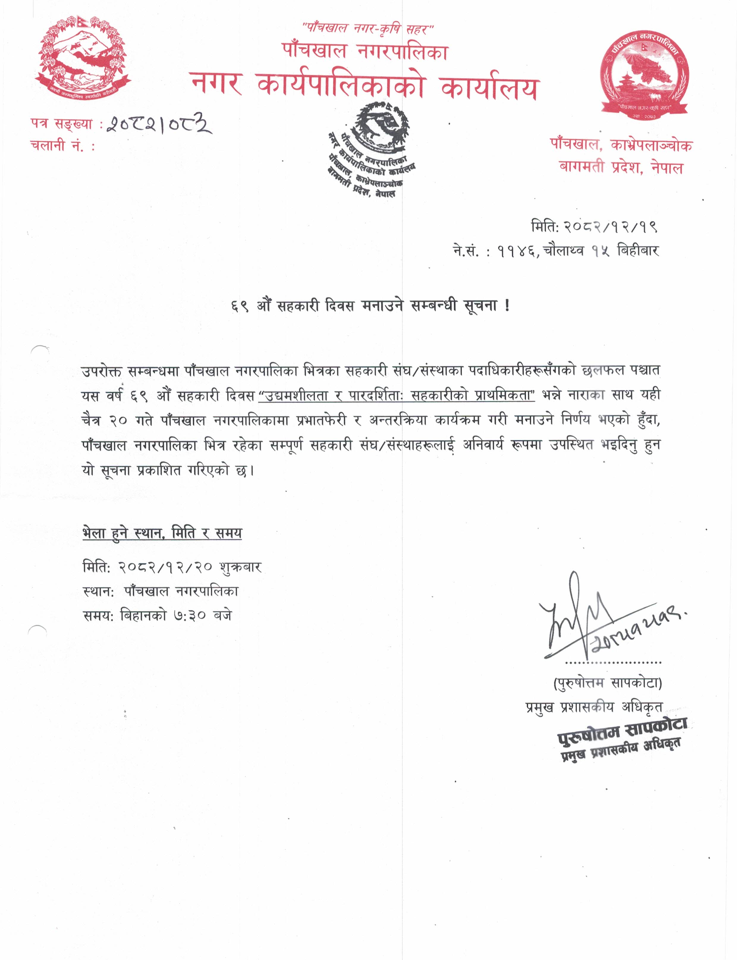 ६९ औँ सहकारी दिवस मनाउने सम्बन्धमा सूचना