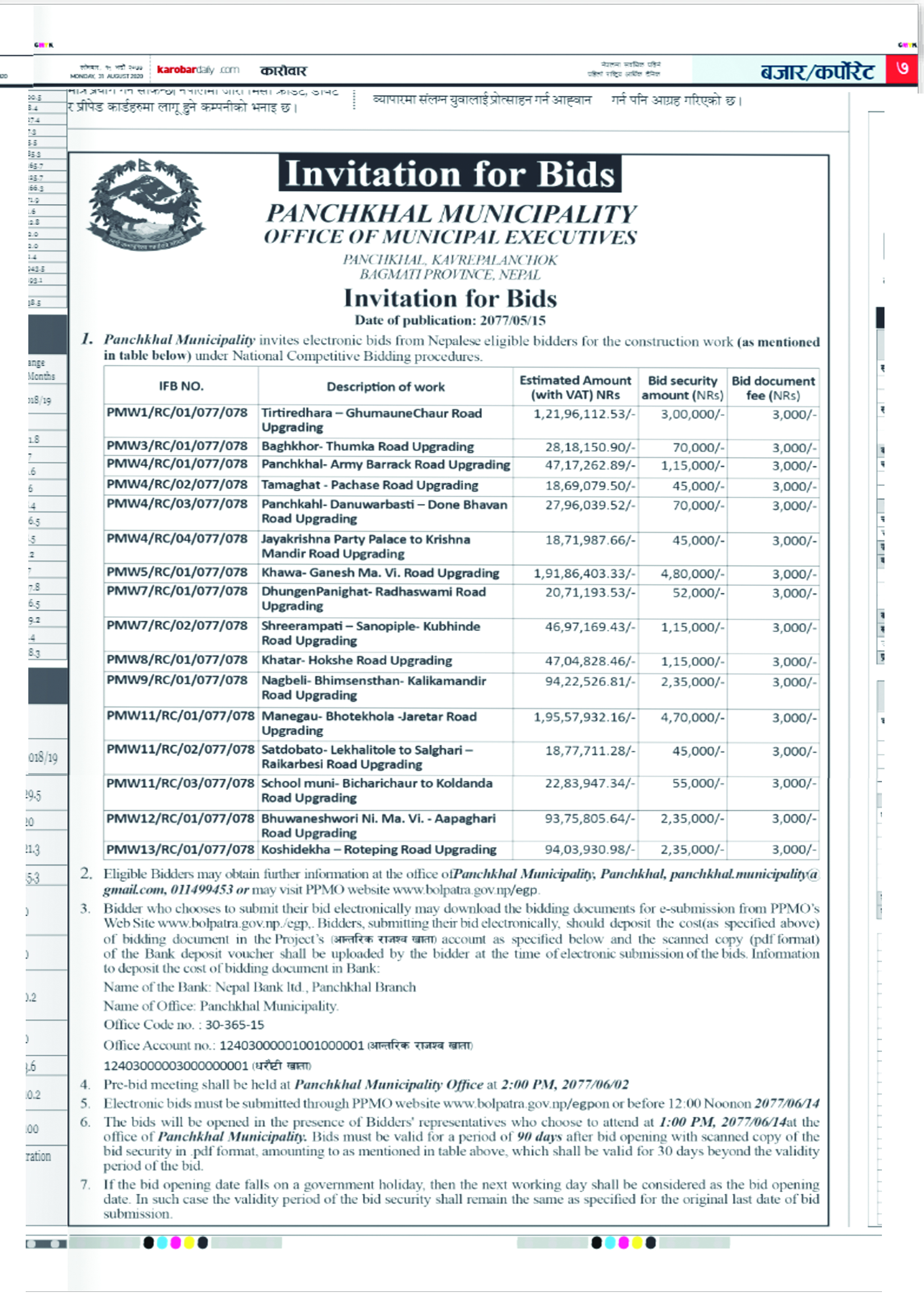 Invitation for Bids for Upgrading of various roads of Panchkhal Municipality, Published on Karobar Daily, 2020/08/31