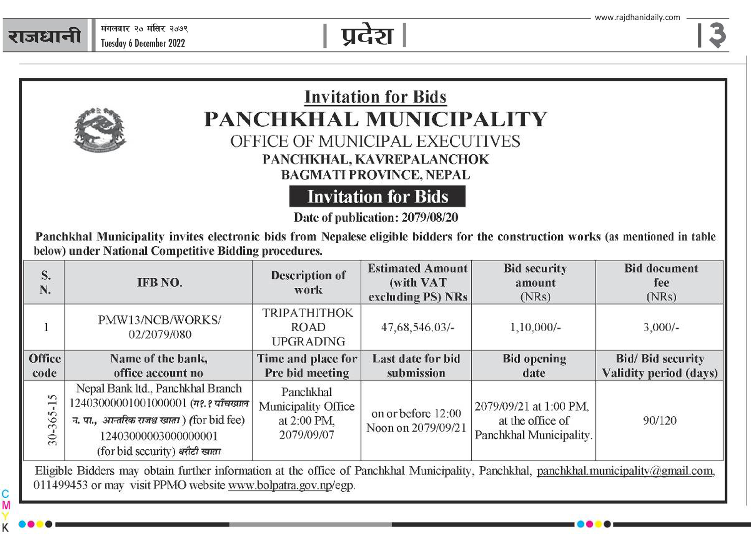 Notice about Invitation of Bids for Road Upgrading_Published on Rajdhani Daily_2022_12_06