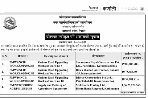 बोलपत्र स्वीकृति गर्ने आशयको सूचना (मिति: २०८२–०१–०३)