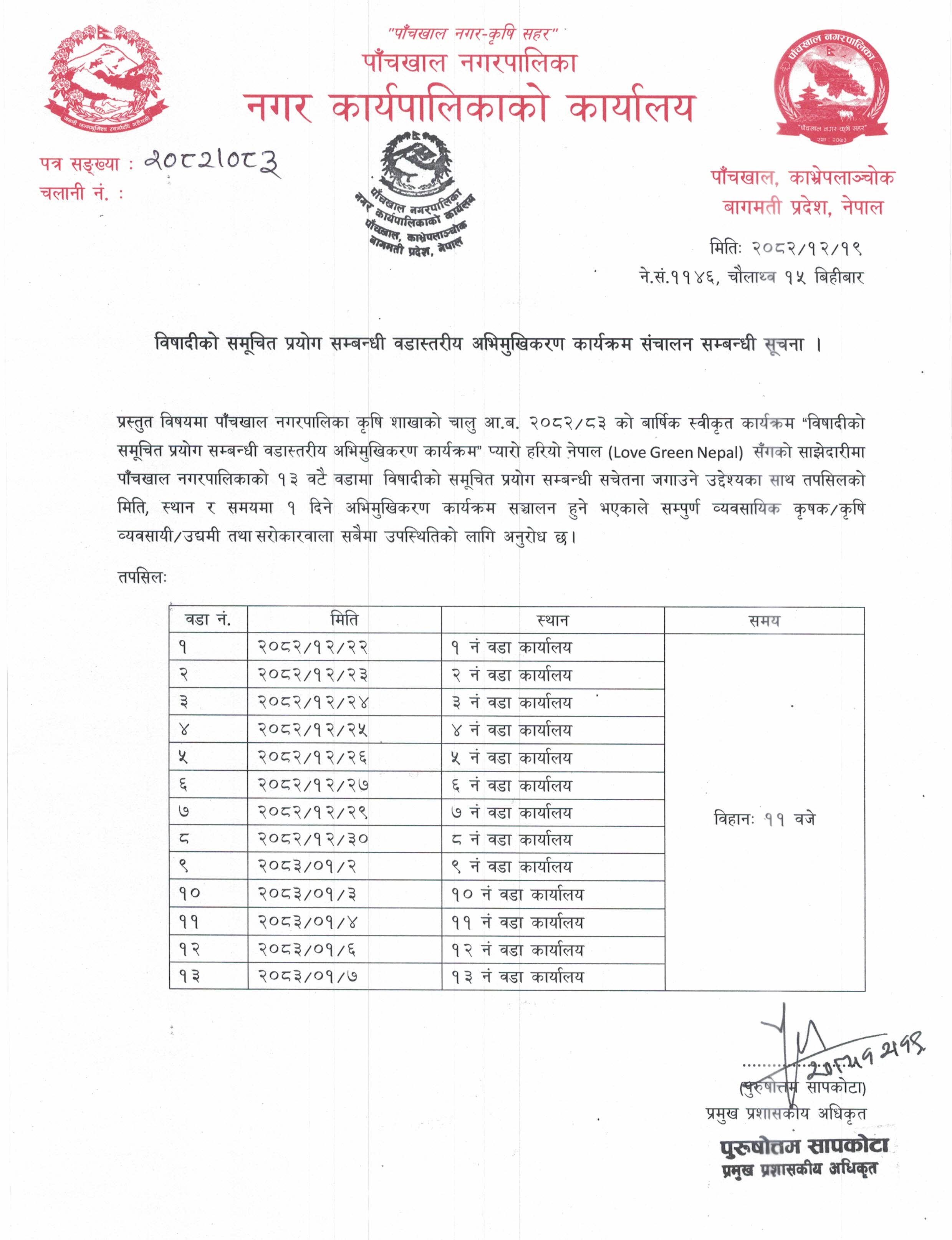 बिषाधि समुचित प्रयोग सम्बन्धी वडा स्तरीय अभिमुखीकरण कार्यक्रम संचालन सम्बन्धी सूचना