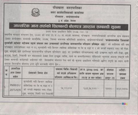 Tender Notice about internal revenue of Panchkhal Municipality, Published on "Naya Patrika", 2018/08/08