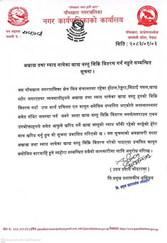 अखाद्य तथा म्याद नाघेका वस्तु बिक्री वितरण गर्न नहुने सम्बन्धी सूचना