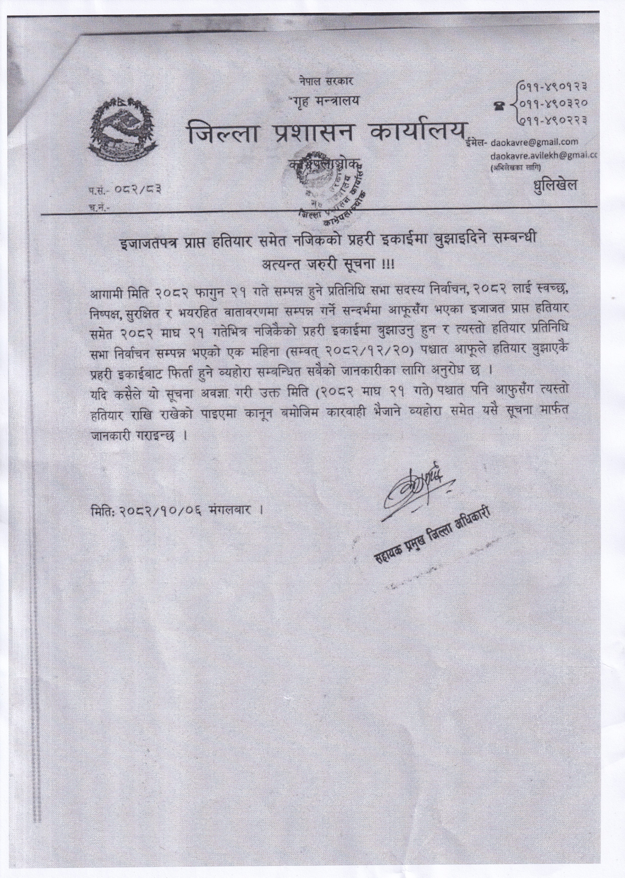इजाजतपत्र प्राप्त हतियार समेत नजिकको प्रहरी इकाईमा बुझाइदिने सम्बन्धी अत्यन्त जरुरी सूचना