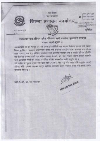 » इजाजतपत्र प्राप्त हतियार समेत नजिकको प्रहरी इकाईमा बुझाइदिने सम्बन्धी अत्यन्त जरुरी सूचना