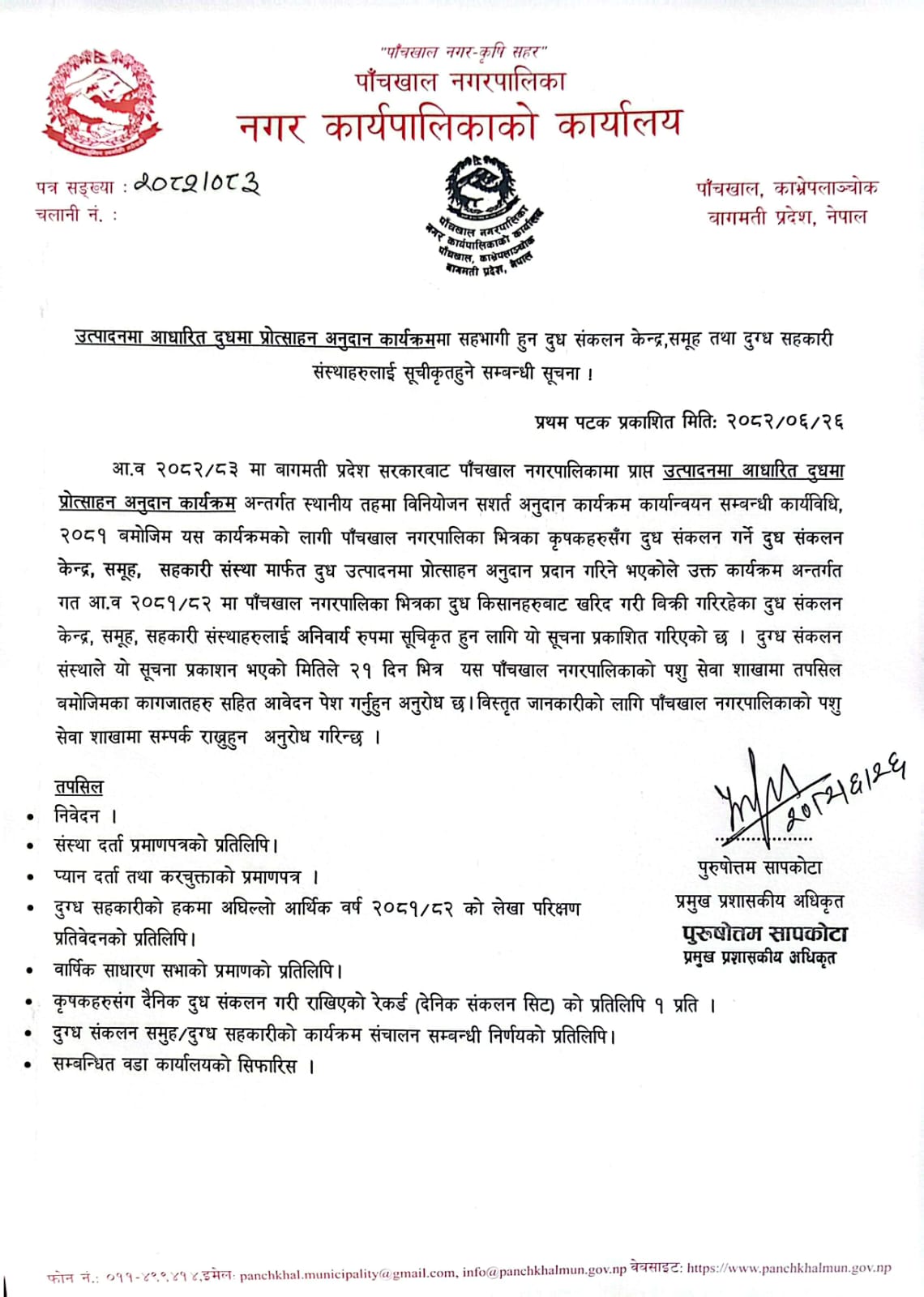 उत्पादनमा आधारित दुधमा प्रोत्साहन अनुदान कार्यक्रममा सहभागी हुन दुध संकलन केन्द्र , समूह तथा दुध सहकारी संस्थाहरुलाई सूचीकृतहुने सम्बन्धी सूचना ।