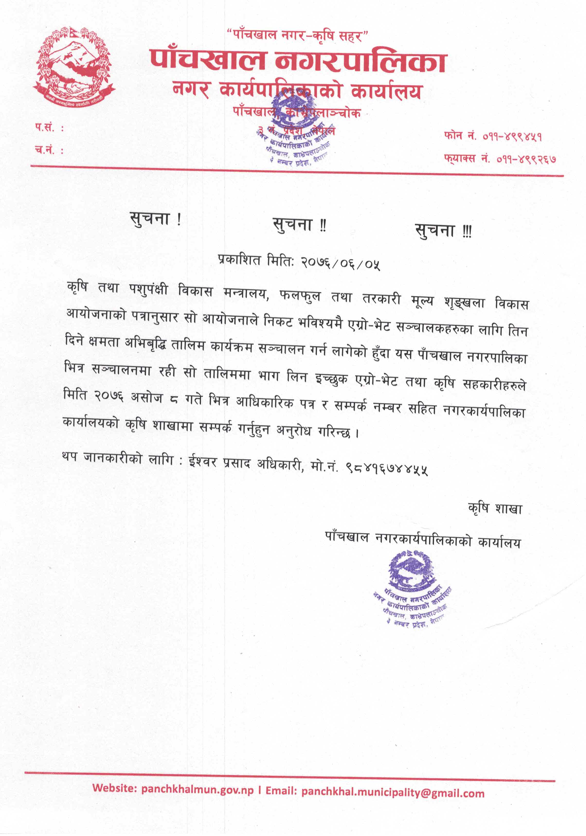 » कृषकहरुलाई क्षमता अभिबृदि तालिम सम्बन्धी संसोधित सूचना, २०७६/०६/०५
