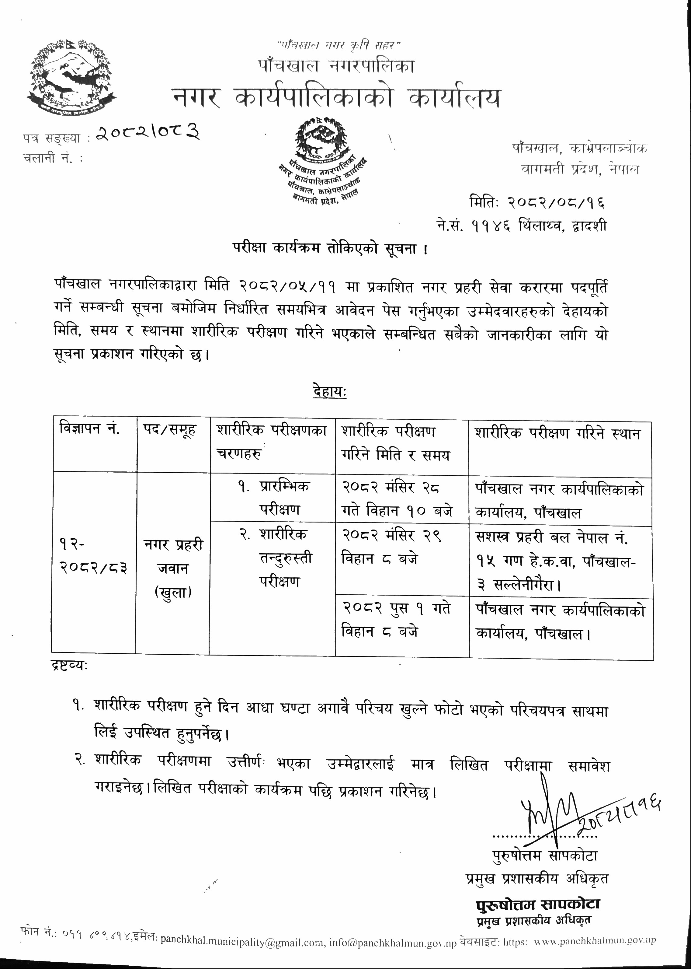 नगर प्रहरीका लागि परीक्षा कार्यक्रम तोकिएको सम्बन्धी सूचना