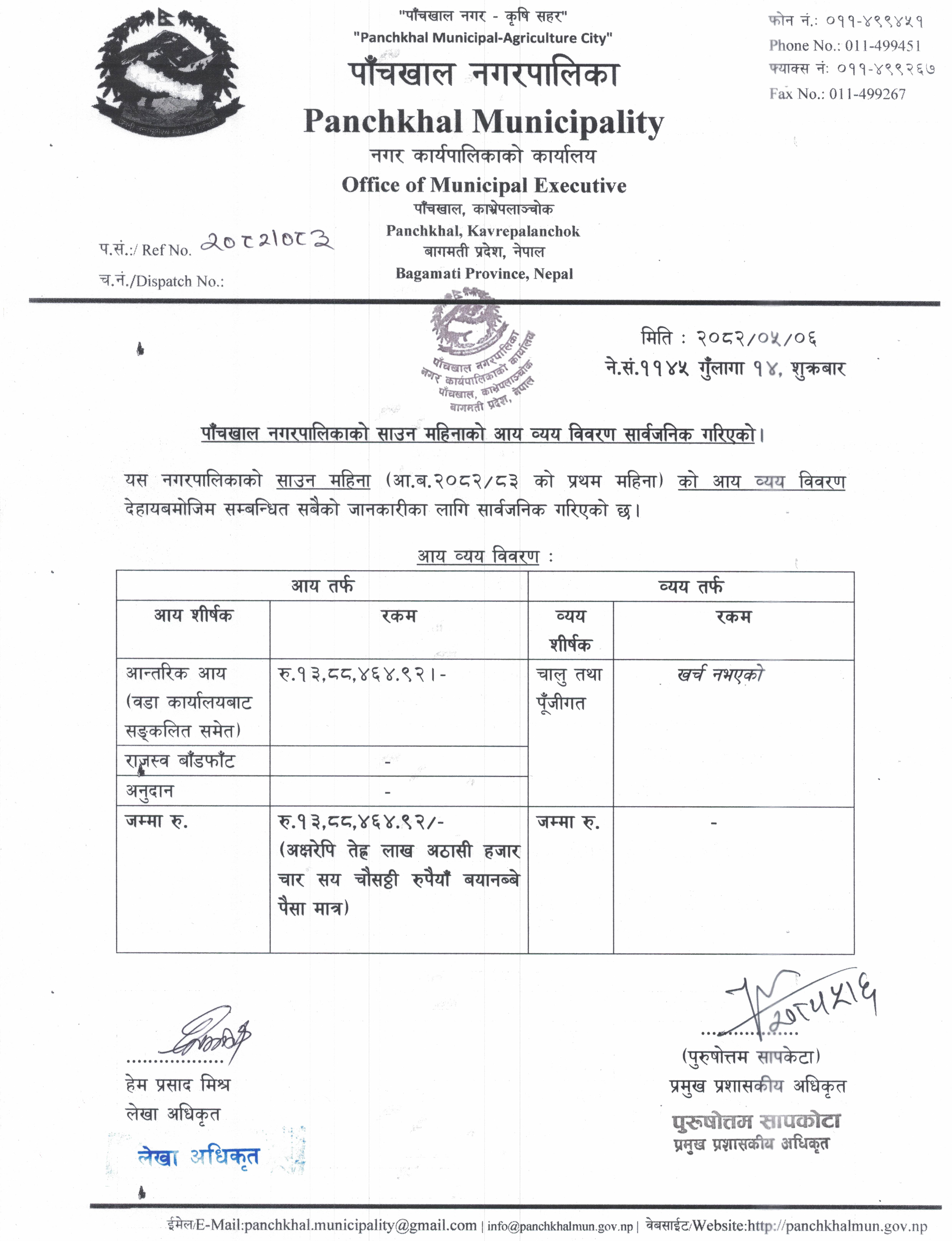 पाँचखाल नगरपालिकाको साउन महिनाको आय व्ययको विवरण सार्बजनिक गरिएको ।