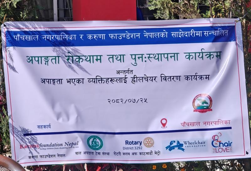पाँचखाल नगरपालिका र करुणा फाउण्डेशन नेपालको साझेदारीमा सञ्चालित अपाङ्गता रोकथाम तथा पुनःस्थापना कार्यक्रम अन्तर्गत अपाङ्गता भएका व्यक्तिहरूलाई व्हीलचेयर वितरण कार्यक्रम मिति २०८२/०७/२५ सम्पन्न भएको छ।